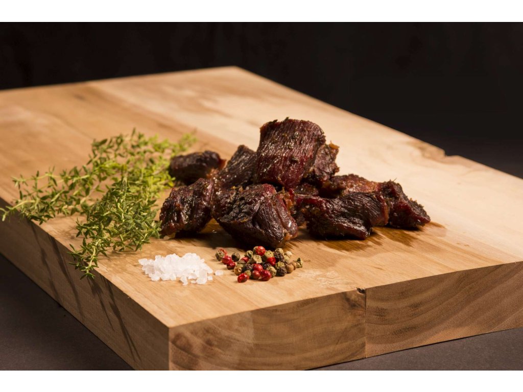 Je to steak, není to steak? Tak trochu oboje. Aby se Vám lépe jedlo ze sáčku, udělali jsme Vám ze steaku kostky. A to ne ledajaké, neboť se jedná o prvotřídní hovězí z mladých býčků. Aby zkřehlo, naložili jsme jej přes noc do oleje a tymiánu, který mu přidá tu správnou vůni a finální chuť. Poté jej vložíme do trouby a pečeme. Závěrečná sterilace se již jen podepíše na tom, že se maso krásně na jazyku rozpadá a krásně naplní vaše chuťové pohárky. Jeho nízká hmotnost jej, tak jako další 100% masa, předurčuje k tomu jej vzít do batohu na pěší výlety, když cestujete na lehko.