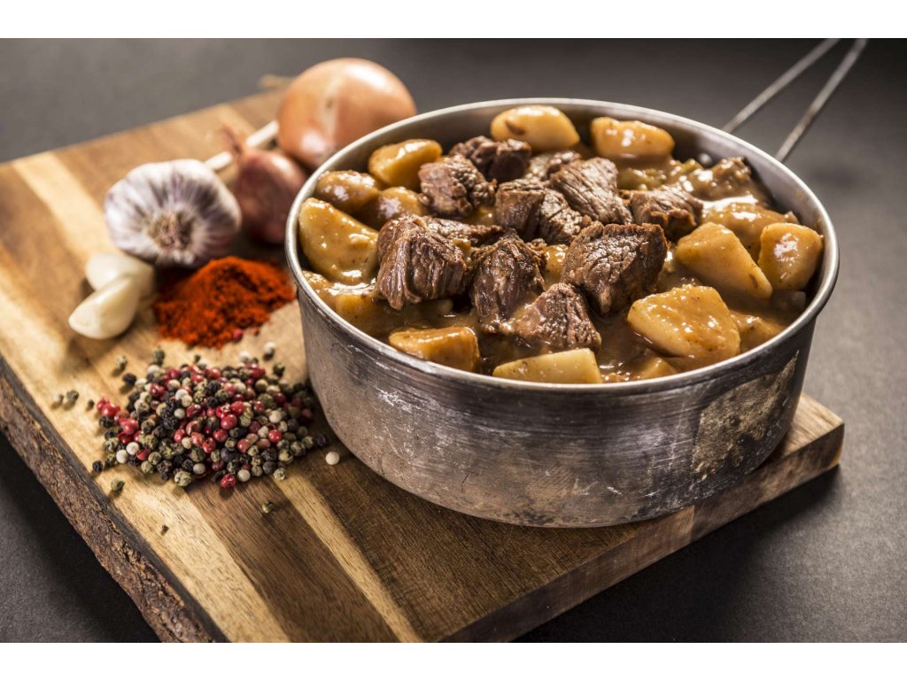 brambory (36%), hovězí maso přední (30%), cibule, mouka rýžová, mouka kukuřičná, řepkový olej, rajský protlak (rajčata, sůl, cukr), česnek, sůl, paprika, pepř.