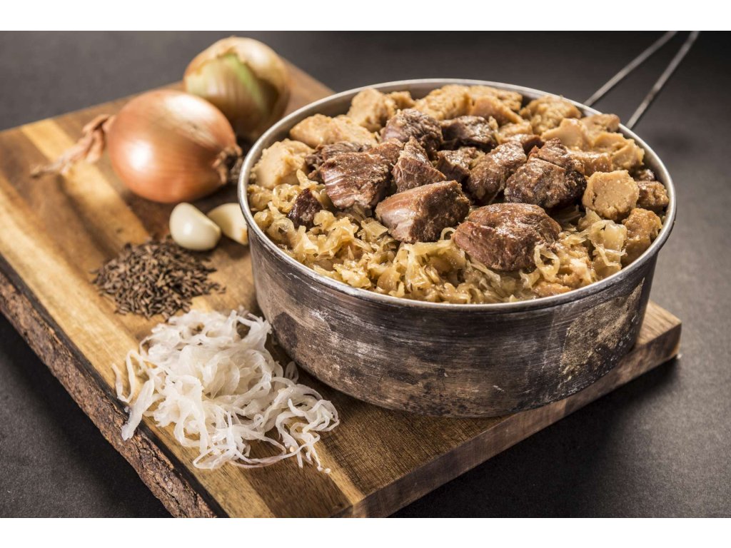 Vepřová plec (30%), bramborové špalíčky(28%) (pšeničná mouka, bramborové vločky /SO2/, pšeničná krupice, sůl, vaječná směs, koření), zelí kysané (26%)(zelí, voda, sůl, kmín), řepkový olej, cibule, mouka rýžová, mouka kukuřičná, cukr, česnek, ocet, sůl, kmín, pepř.