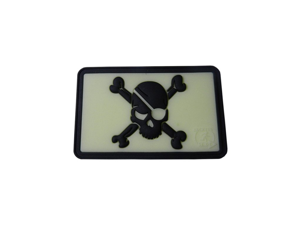 Plastová obdélníková nášivka na suchý zip, na které je pirátská lebka s páskou přes oko a zkřížené hnáty. Po nasvícení sama svítí ve tmě.