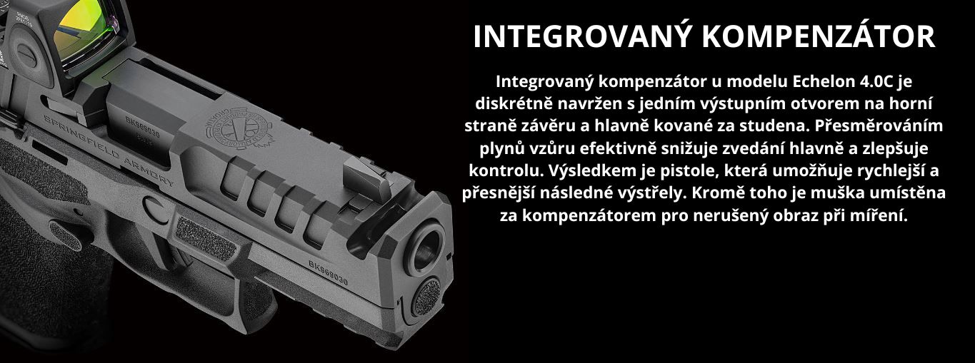 Navržena pro nošení, pistole Echelon™ 4.0C si zachovává klíčové vlastnosti plnohodnotného modelu, avšak s kratší 4" hlavní a kompaktním rámem pro lepší skryté nošení. Revoluční systém Variable Interface System nabízí bezkonkurenční kompatibilitu přímé montáže s předními světovými kolimátory, doplněnou o tritiová mířidla U-Dot pro rychlé zaměření cíle. Sériově značená centrální provozní jednotka je usazena v kompaktním rámu a nabízí kapacitu 15 nábojů se zapuštěným zásobníkem a 18 nábojů s prodlouženým zásobníkem.