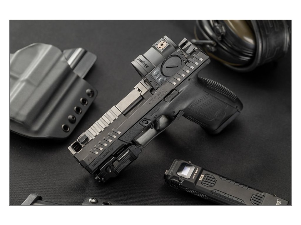 Model s integrovaným kompenzátorem zdvihu ve formě jednoho velkého portu na ústí hlavně pro snížení zpětného rázu a rychlejší opětovné zamíření. Za studena kovaná hlaveň je o 10 % těžší než u standardní verze pro ještě lepší stabilitu při střelbě. Plně oboustranné ovládání, rozšířené natahovací drážky na horní části závěru, příprava pro montáž kolimátoru (Optics-Ready) a kompatibilita s mířidly CZ P-09 NOCTURNE. Bezpečnostní prvky zbraně: pojistka spouště, pojistka táhla spouště, blokace úderníku.