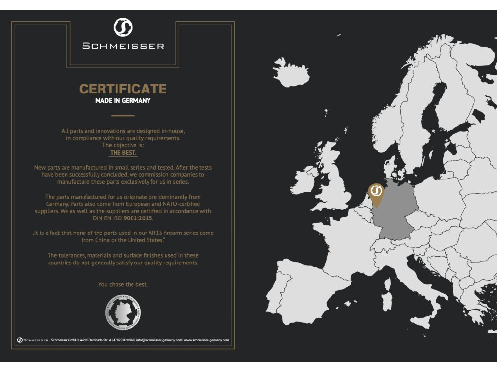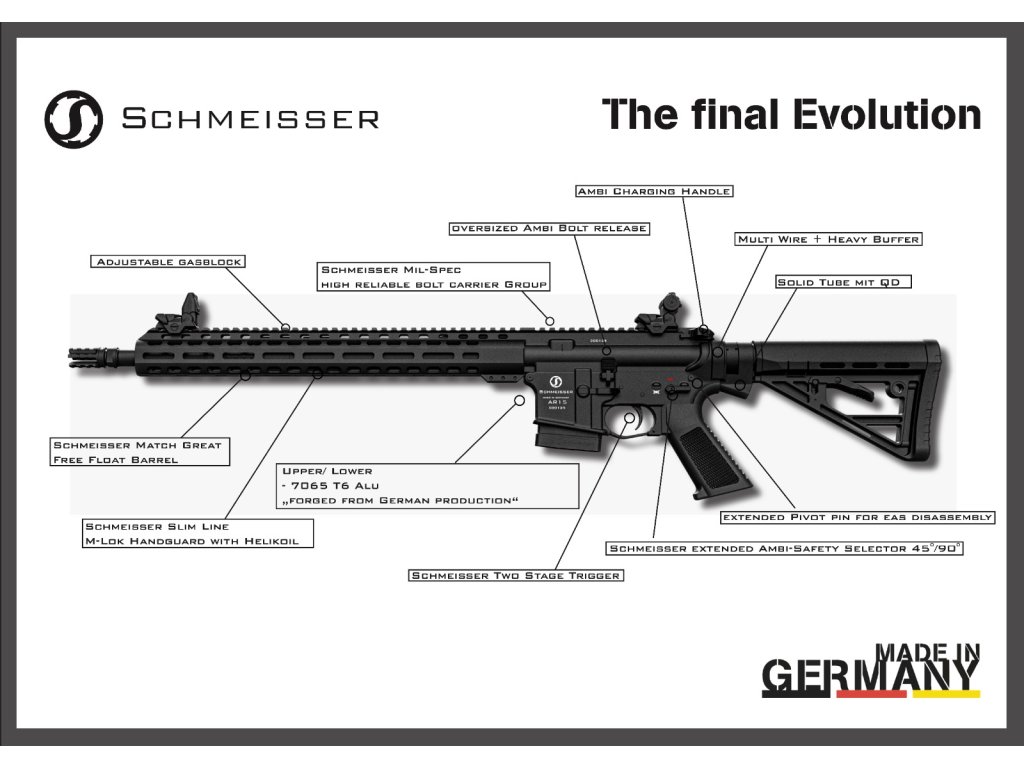 Puška používá pouze nejkvalitnější materiály a je kompletně sestavena v Německu, v dílnách firmy Schmeisser v Krefeldu. Všechny díly, které nejsou přímo od firmy Schmeisser (a těch je opravdu minimum) pochází pouze od evropských NATO certifikovaných výrobců. Puška je určená pro lovecké i sportovní použití a pro sebeobranu.