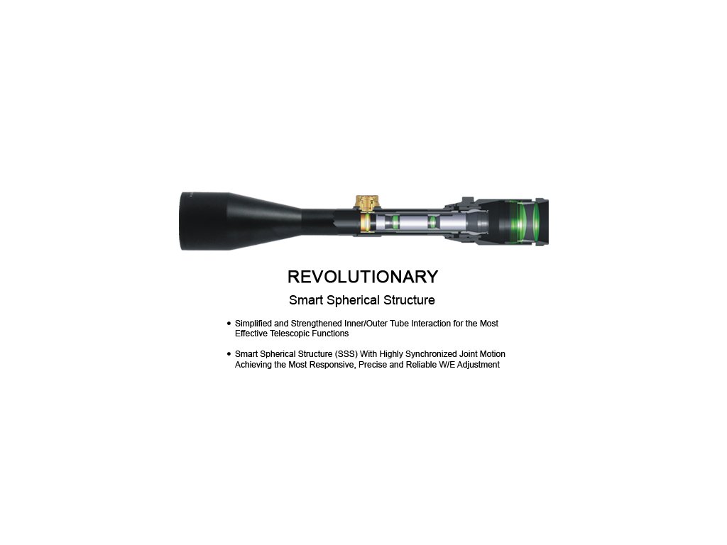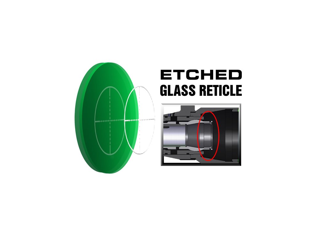 - Záměrná osnova: MIL-DOT rytá do skla ve druhé fokální rovině (SFP), podsvícení červené/zelené nebo nastavitelné v 36 barvách a intenzitách, plněno dusíkem
